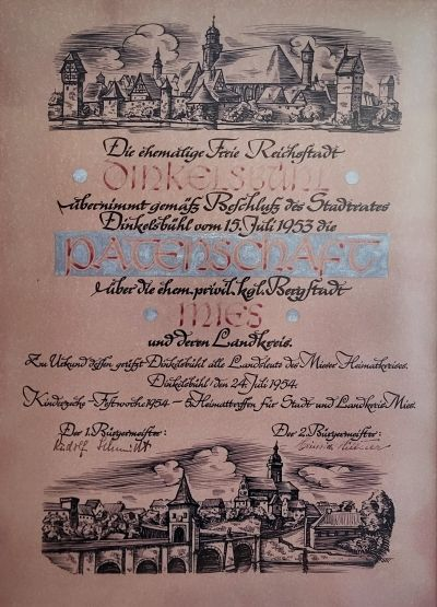 Im Jahre 1953 hat die Stadt Dinkelsbühl die Patenschaft über die Stadt und Mies und den gleichnamigen Landkreis übernommen.